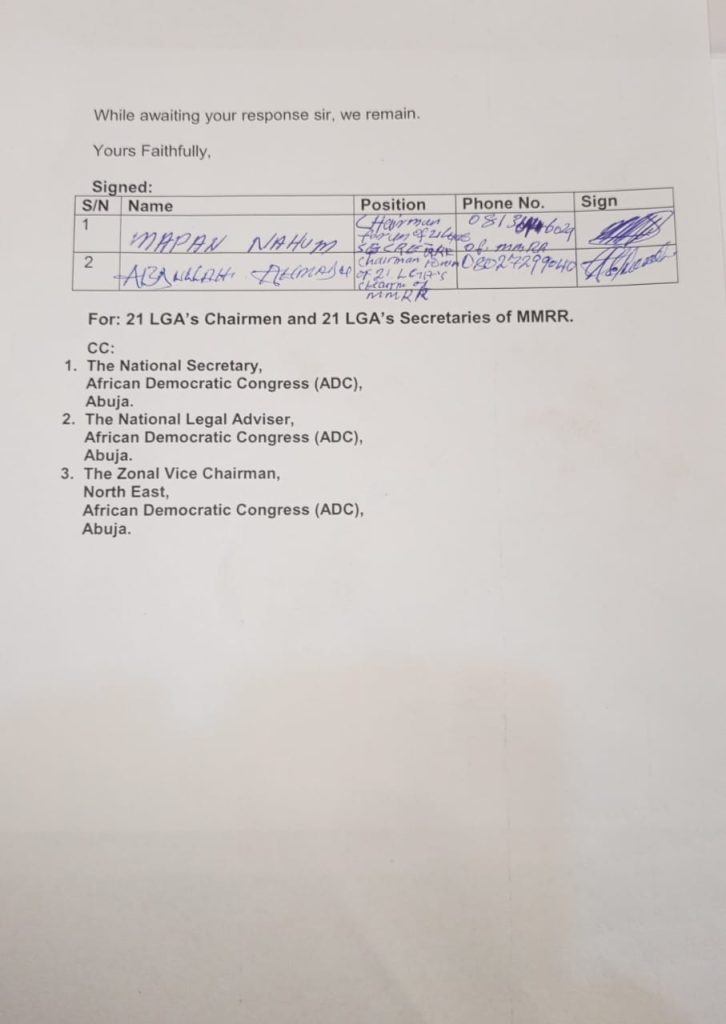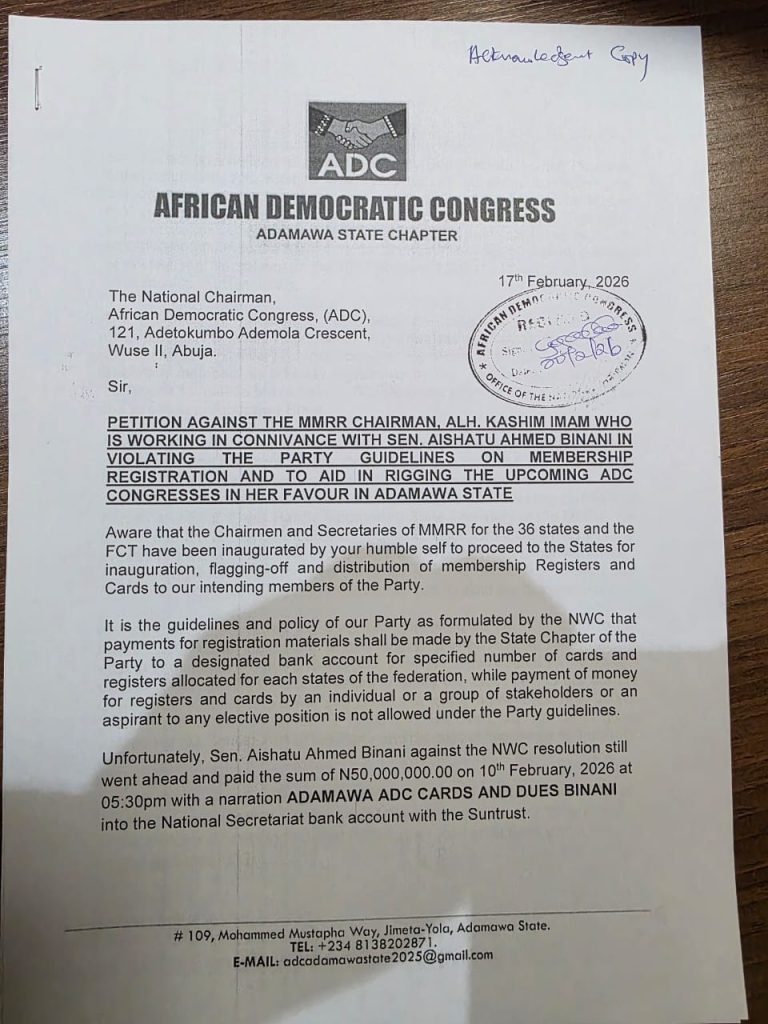 In their prayers, the petitioners called on the National Working Committee to urgently caution Alhaji Kashim Imam to operate strictly within party guidelines and to desist from actions capable of creating factions within the Adamawa State chapter of the ADC.